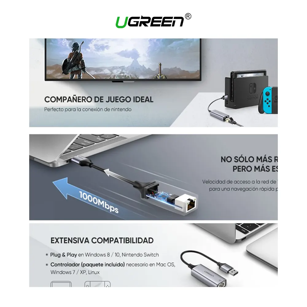 Adaptador UGREEN USB 3.0 a Ethernet RJ45 Para Nintendo Switch, Windows, macOS y más