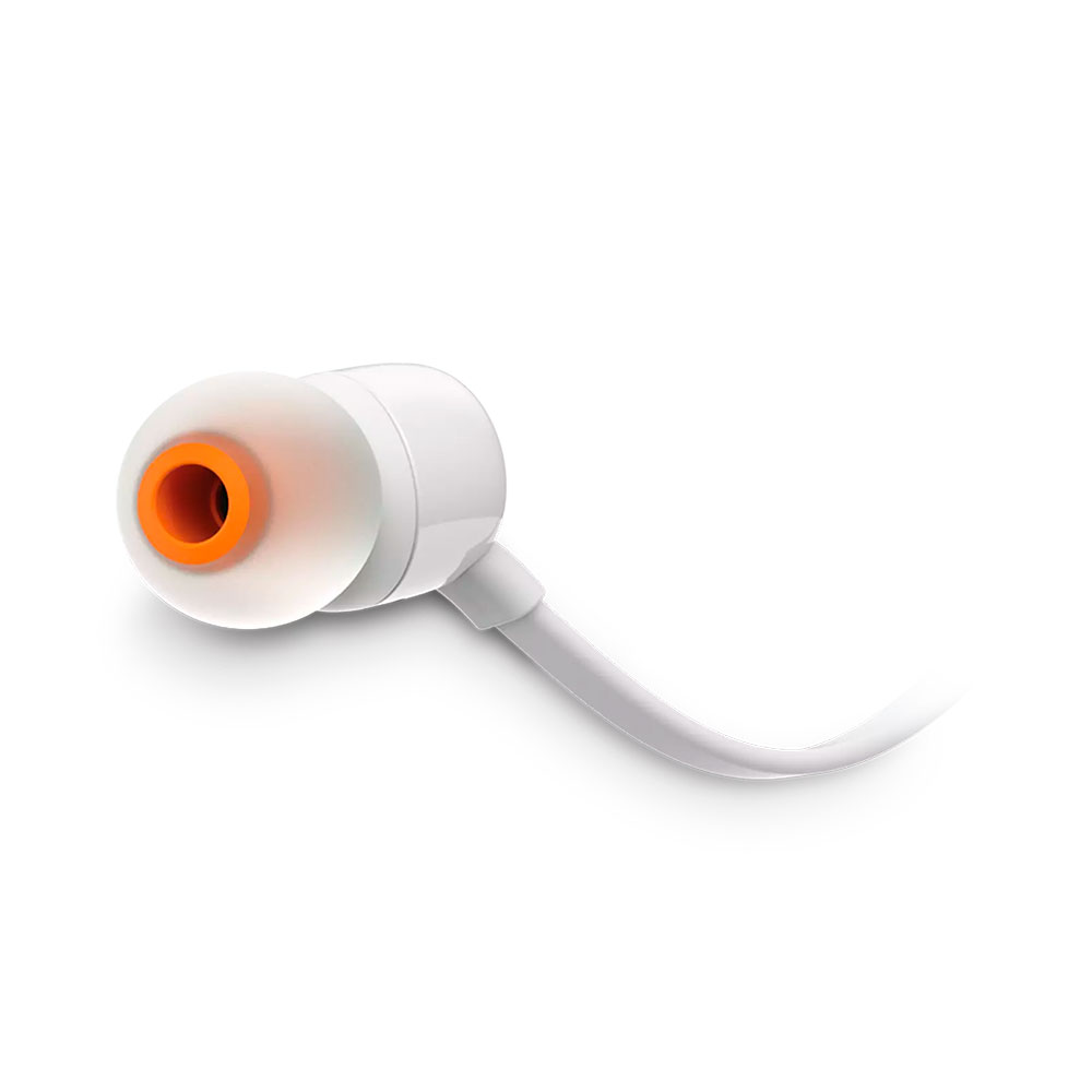 Audífonos in ear con micrófono JBL T110 cable plano, conector 3.5 mm, control de música y llamadas, blanco