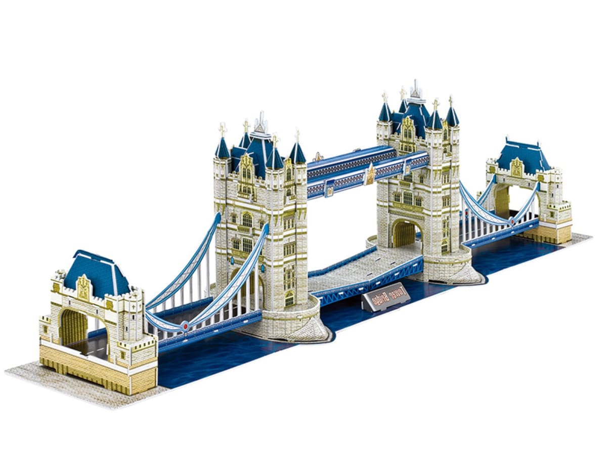 TOWER BRIDGE MEDIANO Modelo Puzzle 3D Arma y transportate a Londres con el Tower Bridge, el puente más famoso de la ciudad, con 120 años de antigüedad, está hecha de cartón pluma, sus piezas se ensamblan sin pegamento u otro material adicional, incluye manual de instrucciones. Disfruta el armado de este impresionante modelo, pensando en usuario con una edad desde 10+