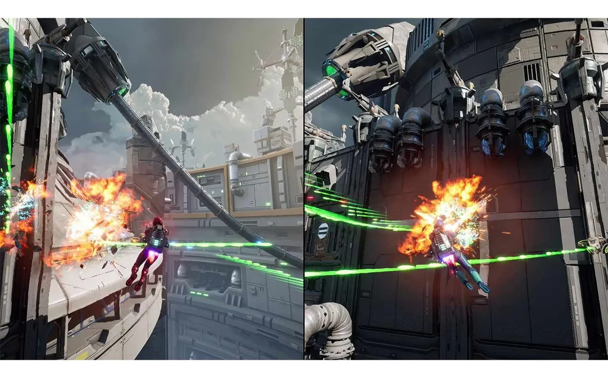Implementa la tecnología "Dual-Render Sync", que permite procesar dos mundos independientes al mismo tiempo a 60 FPS estables sin ninguna caída de rendimiento.Utiliza el sistema de físicas avanzadas de la nueva consola para permitir que los objetos pasen de una mitad de la pantalla a la otra, reaccionando a la gravedad de forma dinámica.