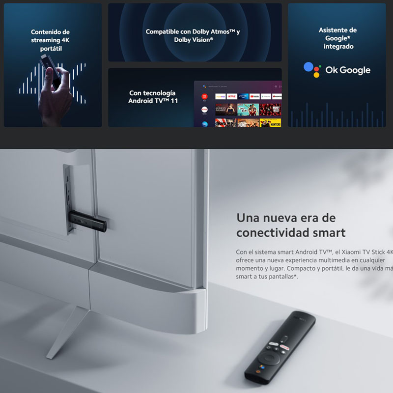 DESCRIPCIÓN Xiaomi TV Stick 4K, imágenes aK y mando con control remoto para tu televisor Procesador Quad-Core Cortex-A35 – 2GB de RAM – 8GB de memoria interna – Mando incorporado – Android 9.0 Pie – WIFI 2.4GHz/5GHz – Bluetooth 5.0 – HDR10/HDR10+/HLG/Dolby Vision/Dolby Atmos Xiaomi Mi Stick TV 4K es la evolución del pequeño stick de la marca china. Mantiene muchos de los detalles de su anterior versión, y, ahora, te permitirá ver imágenes a 4K y 30 fps. Convertirá tu viejo televisor en una Smart TV con lo que reproducirás contenido en streaming y jugarás a los videojuegos que más te gustan. Con un diseño minimalista y de dimensiones reducidas, es uno de los modelos más fáciles de transportar. Sólo métetelo al bolsillo y llévalo al piso de tu amigo o a la casa de la playa. Android TV 11 con calidad 4K Y, ahora, vamos con su utilidad principal. Con el Xiaomi Mi Stick TV 4K podrás tener acceso directo al contenido en streaming de tus plataformas favoritas, e incluso vienen preinstalados Amazon Prime Video y Netflix. Además, incluye la Google Play Store para que descargues las aplicaciones que usas, desde Youtube a Spotify. Todo ello movido por el sistema operativo Android TV 11, que potencia su rendimiento. Y cuenta con ventajas visuales y auditivas como la compatibilidad con HDR10, HDR10+, HLG, y Dolby Atmos. Videojuegos, Chromecast y Google Assistant Como ya te veníamos diciendo, la Google Play Store te permite descargar tus juegos favoritos, para jugar. Su conexión Bluetooth 5.0 te permitirá conectarle un Xiaomi Gamepad o un Xiaomi Mi Portable Mouse y que tengas un mejor control en cada partida. Viene con Chromecast para que puedas mantener en comunicación tu smartphone y tu Mi Stick 4K y enviar información de uno a otro. Además, posee tecnología DLNA y Miracast. Por último, dentro de la caja encontrarás un mando con control por voz. Sólo con decir ‘OK, Google’ despertarás al asistente y, mientras estás tirado en el sofá, le pedirás que quieres que te ponga. Fácil y rápido. Especificaciones técnicas Xiaomi TV Stick 4K: Marca: Xiaomi Modelo: MDZ-27-AA – PFJ4122EU Sistema Operativo: Android TV OS 11 Aplicaciones compatibles: Vídeo Streaming: Netflix, Amazon Prime Video, Disney+, Atresmedia Player, Youtube, Movistar TV, RedBull TV y más Tienda de aplicaciones: Sí (Play Store) Juegos Android Mirroring: Sí, Google Cast (Chromecast), DLNA, Miracast, PLEX Asistente de Google Idiomas disponibles: Multilenguaje (Español, Inglés, Portugués, Alemán, Chino, Italiano, Francés, Holandés, Ruso y más) Hardware: CPU: Quad-core Cortex-A35 GPU: Mali G31 Mp2 a 850MHz RAM: 2GB DDR4 Memoria interna: 8GB eMMC Resolución (Salida de vídeo): 4K / 60 – 30 fps 2K / 60 – 30 fps Full HD / 60 – 30 fps HD / 60 – 30 fps Codificación (Resolución soportada): H.265 HEVC H.264 AVC H.264 MVC AV1 VP9 P-2 Calidad de visión: HDR10 y HDR 10+ HLG Formatos de vídeo soportados: RM/MOV/VOB/AVI/MKV/TS/WMV/MP4 Audio: Formatos soportados: MP3/WMA/ACC/Flac/OGG DTS HD Dolby Atmos Compatible con sistemas de audio 5.1 Foto: Formatos de fotografía soportados: JPEG/BMP/GIF/PNG Subtítulos soportados: No Mando a distancia: Sí, control remoto bluetooth (Alimentación con 2 x Pilas AA) Control por voz: Sí, mediante control remoto Conexiones inalámbricas: Bluetooth: Bluetooth 5.0 Wi-Fi: 802.11a/b/g/n/ac, Dual-band Wi-Fi 2.4GHz/5GHz (Antena interna) Conexiones: HDMI: 1 x HDMI 2.0a (HDCP 2.2) USB: 1 x Micro USB Dimensiones: 110 x 30 x 15.2 mm Color: Negro Contenido de embalaje: 1 x Xiaomi TV Stick 4K 1 x Control remoto 2 x Pilas AAA para el mando 1 x Extensor para el HDMI 1 x Adaptador de corriente