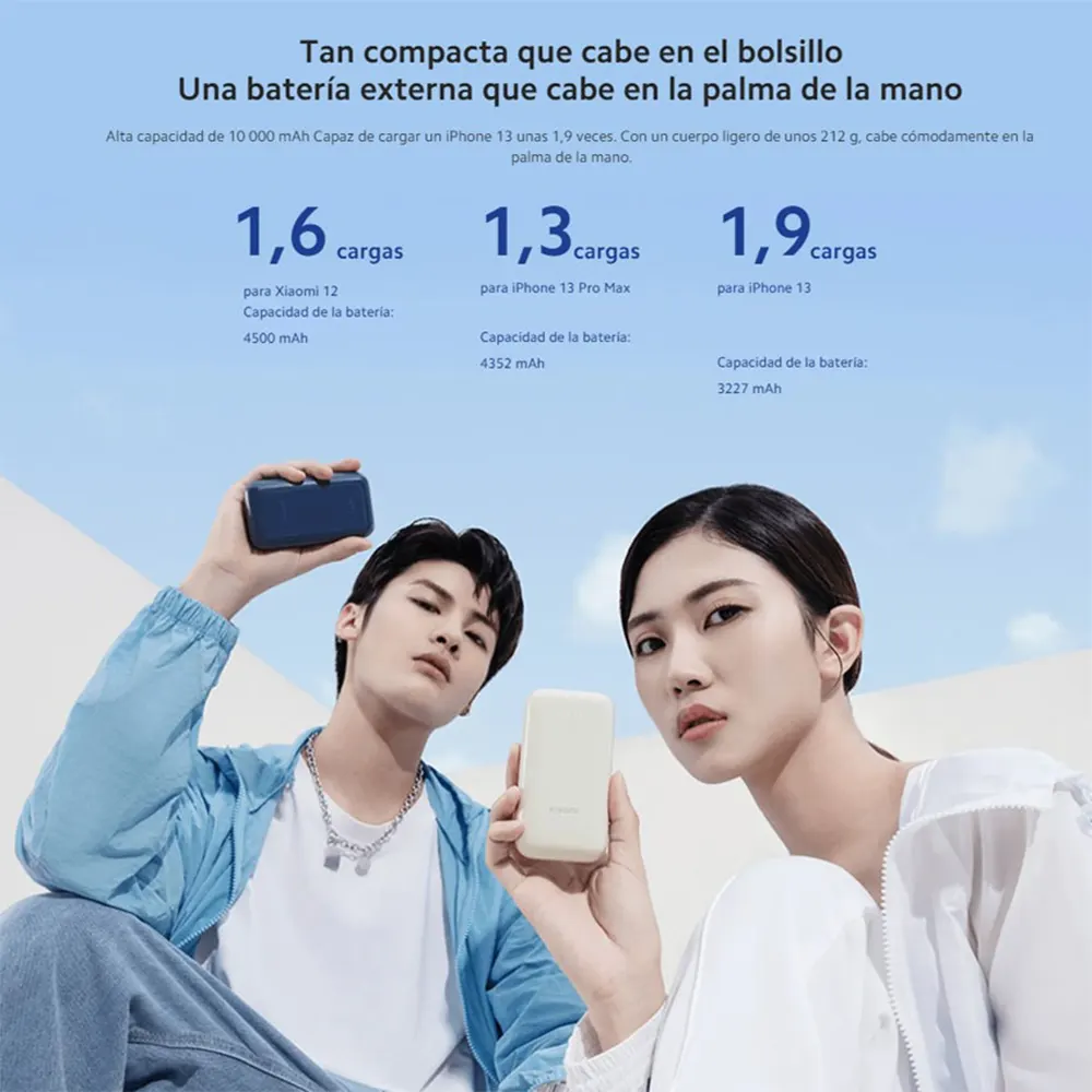 DESCRIPCIÓN Xiaomi 33 W Pocket Edition Pro, Power Bank de 10.000 mAh con un diseño compacto y cómodo de llevar Banco de energía – Diseño ligero y compacto – Batería de 10.0000 mAh – Carga rápida máxima de 33 W – Carga rápida bidireccional – Puerto de entrada USB Tipo-C – Puerto de salida USB Tipo-A y Tipo-C – Protección contra sobrecalentamiento y sobretensión – Azul La PowerBank Xiaomi 33W Pocket Edition Pro tiene un diseño ligero que cabe en el bolsillo, por lo que la convierte en un compañero de viaje ideal. Además incluye sistemas de protección para mayor tranquilidad. Permite la carga de dos dispositivos a la vez gracias a sus dos puertos USB Tipo-A (para salida) y USB Tipo-C (para entrada y salida). Esta variedad de puertos permite que se adapte fácilmente a gran cantidad de dispositivos como diferentes smartphones, auriculares, tablets, etc. Diseño ligero Su diseño compacto y peso ligero hacen de la PowerBank Xiaomi 33W Pocket Edition Pro un compañero de viaje ideal. Incluye carga bidireccional gracias al puerto USB Tipo-C y viene con un cable tipo USB-C a USB-A para poder cargar diferentes dispositivos. Puertos de carga La Xiaomi 33W Pocket Edition Pro puede cargar de forma segura y simultáneamente dos dispositivos. Para poder cargar dos dispositivos a la vez en la parte superior incorpora además de un botón dos puertos USB, un puerto USB Tipo-A y un puerto USB Tipo-C bidireccional. Carga bidireccional Este banco de energía es capaz de cargarse por completo en 2,7 horas a través de su puerto USB C con una potencia de entrada de 22,5 W. Por otro lado este USB C ofrece una carga rápida con una potencia máxima de salida de 33 W. Todo esto gracias a su batería de 10.000 mAh. Sistemas de protección La PowerBank Xiaomi 33W Pocket Edition Pro incorpora dos sistemas de seguridad, un sistema de protección contra cortocircuitos y sistema de protección contra sobrecarga. Además cumple con las Normas Internacionales de Aviación por lo que este dispositivo es muy seguro para llevarlo en viajes en avión. Especificaciones Técnicas Xiaomi 33W Power Bank 10000mAh Pocket Edition Pro Azul: Marca: Xiaomi Modelo: Pocket Edition Pro 33W EAN: 6934177771682 Puerto de entrada: Tipo-C Puerto de salida: USB-A/Tipo-C Conectividad: USB-A: 5V⎓3V 9V⎓2.23A 12V⎓1.67A 10V⎓2.25A MÁX. USB-C: 5V⎓3V 9V⎓3A 12V⎓2.25A 11V⎓3A MÁX. Otras características: Protección contra sobretensión y sobrecalentamiento Tiempo de carga del powerbank: 2,7 horas Potencia máxima de carga 33W. Dimensiones: 10,5 × 5,58 × 2,55 cm Tipo de batería: batería de iones de litio Batería: 35,2 Wh/36 Wh 9800 mAh/10000 mAh Temperatura de funcionamiento: 5 °C~35 °C Color: Azul Contenido del paquete: 1 x Xiaomi 33W Power Bank 10000mAh Pocket Edition Pro Azul ** GARANTIA DE 60 DIAS SOLO POR DEFECTOS DE FABRICA ***
