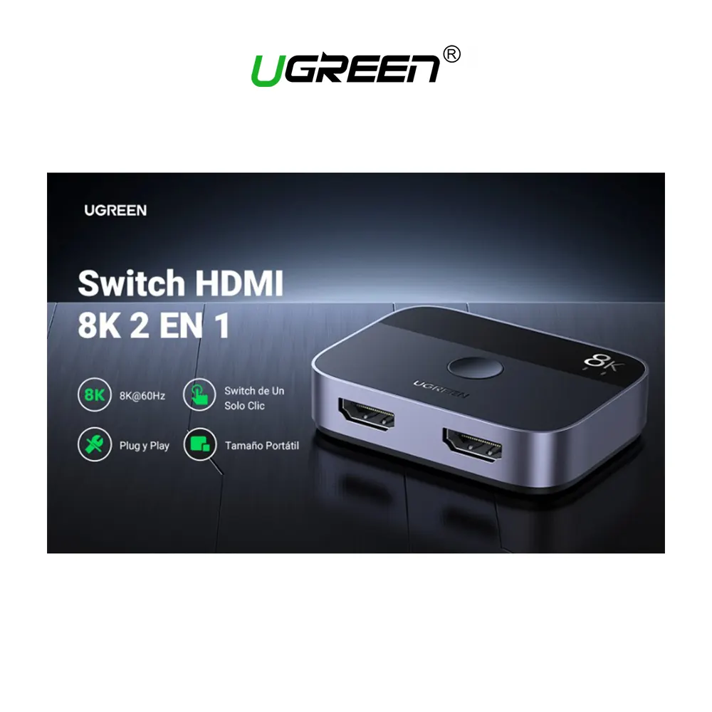 ✅ UGREEN HDMI 2.1 Switch 8K60Hz 2 en 1 – Modelo: 90385 ✅ Conmutador HDMI de 2 en 1 salida es totalmente compatible con todos los dispositivos de vídeo HDMI ✅ Divisor HDMI 8k@60hz es compatible con versiones anteriores, pero no puede «actualizar» un conmutador HDMI 1.4 o 2.0 a 2.1 ✅ Conmutador HDMI 8K es su solución que conecta perfectamente 2 fuentes de video a 1 pantalla (NO es compatible con 1 entrada 2 salidas) ✅ Entrada HDMI: Compatible con computadora, Xbox 360, Xbox One, PS3/ PS4/ PS5, reproductor de DVD Blu-Ray, Route Roku, TV stick, Chromecast, PC, etc ✅ Salida HDMI: Compatible con televisores HD-Ready, Full HD, Apple TV, monitores, proyectores, etc ✅ Admite frecuencia de actualización variable VRR AMD Free-Sync G-Sync. Adaptador Splitter Switch 2en1 UGREEN HDMI 2.1 8K 4K 120Hz Dolby AC cantidad 1 AÑADIR AL CARRITO