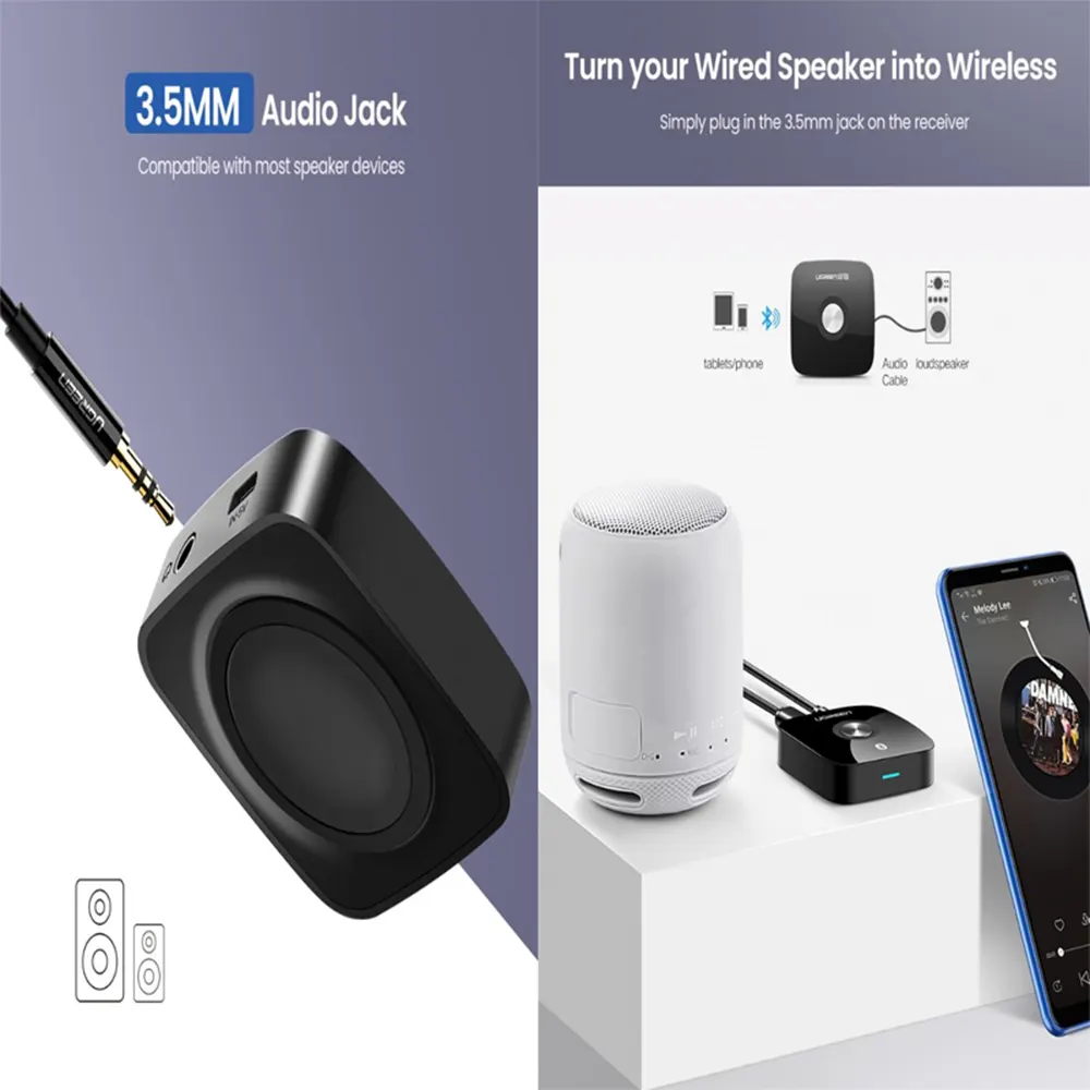 ¡Disfruta Música de Alta Fidelidad de Forma Inalámbrica! Dote de Bluetooth a Su Viejo Equipos de Audio. El UGREEN receptor bluetooth audio cuenta con salidas auxiliar, te permitirá transmitir audio desde un ordenador, móvil, tablet hasta sus equipos de musica antiguos, tales como amplificadores, altavoces o auriculares que no cuenten con tecnología bluetooth. Es un adaptador Bluetooth estupendo y asequible que te ofrece un audio nítido y de gran calidad. Nota Importante Este adaptador bluetooth 3.5mm JACK solo funciona como receptor Bluetooth audio y no como transmisor Bluetooth. Es decir, no compatible con tv.