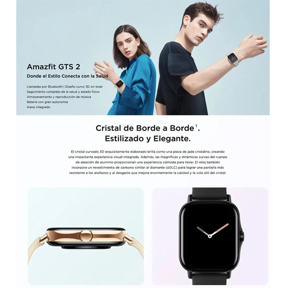 DESCRIPCIÓN Xiaomi Amazfit GTS 2 Reloj Inteligente, Medición de Oxígeno, Contesta WhatsApp Smartwatch deportivo – Pantalla AMOLED de 1.65″ – 12 modos deportivos – Sensor óptico Biotracker PPG 2 – Acelerómetro – Sensor geomagnético – Sensor de presión del aire – Sensor de luz ambiental – GPS+GLONASS – Batería de 246 mAh – Hasta 7 días de uso diario Amazfit GTS 2 de Xiaomi llega ya a nuestras tierras. La nueva versión del reloj inteligente más buscado y vendido de Xiaomi en lo que llevamos de fecha y que marcó un antes y después, por precio y calidad. El GTS 2 es perfecto si lo que buscas es comprar un smartwatch elegante, deportivo y con acabados ultra premium. Amazfit vuelve a la carga con todo lo que se necesita en cuanto a características para medir salud y deporte, acompañado de un diseño delgado y liviano sin bordes, detección de saturación de oxígeno en sangre y mucho, mucho más. ¡Quédate para verlo! El diseño rectangular que tanto nos gusta del GTS a un precio único Lo primero que nos llamará la atención del nuevo smartwatch Amazfit GTS 2 será su increíble aspecto. Así, el vidrio 3D curvado, cuidadosamente tallado bajo el diseño casi sin bordes, imita la apariencia de una delicada gema. Su resistente cuerpo fabricado con aleación de aluminio realza las curvas y funde todos los elementos a la perfección para brindarle la mejor experiencia a tus sentidos visual y táctil. Enamórate a primera vista del GTS 2 y su forma rectangular, su delgadez y su ligereza. Pantalla Súper Retina AMOLED de 341 PPI y 1.65 pulgadas El reloj inteligente Amazfit Gts 2 nos deleitará de igual manera con la pantalla súper retina AMOLED de 1.65 pulgadas. Equiparable a la de un teléfono móvil. Su densidad de píxeles alcanza los 341ppi, mostrando todas las imágenes e información con total nitidez y claridad. Además, para que resista todo lo posible a los golpes y los arañazos, el cristal viene protegido con un recubrimiento de carbono, similar al de los diamantes. Personaliza el dial de tu reloj GTS 2 y sácale el máximo partido Asimismo, podrás customizar el dial de tu reloj inteligente GTS 2 y adaptarlo a tu estilo con 35 diseños de dial distintos (disponibles hasta el momento) a través de la APP Zepp. Y con la Interfaz Modular Digital, la información clave se muestra en el centro, enfocándose en lo que más te importa, permitiéndote personalizar los cinco módulos de contenido (widgets) de la pantalla. Además, siempre podrás visualizar la hora. ¡Sin necesidad de encenderla! Control integral de la salud con el sensor óptico BioTracker PPG 2 Probablemente, ya haya quedado bastante claro lo agradable que es este reloj Xiaomi Amazfit GTS 2 para la vista. Así que, dejemos a un lado todo lo relacionado con el aspecto y maravillémonos ahora con sus parámetros para la protección integral de la salud. Esta función quedará a cargo del ya famoso sensor óptico de seguimiento biológico de alta precisión, BioTracker PPG 2, desarrollado y patentado por la empresa Huami Technology. Medición de la frecuencia cardíaca las 24h y alertas por valores demasiado altos Una de las cosas que puede controlar este sensor óptico es la frecuencia cardíaca. De manera constante y precisa. ¡Las 24 horas del día! De hecho, el Amazfit GTS 2 tiene en cuenta el intervalo de frecuencia cardíaca durante la práctica deportiva, y advierte si detecta un valor demasiado alto. Así podrás reducir los riesgos de enfermedad cardiovascular y mejorar tus entrenamientos. SpO2, porcentaje de oxígeno en sangre La siguiente tarea del sensor óptico Biotracker PPG 2 es la de medir otro indicador de salud también fundamental: el porcentaje de saturación del oxígeno en sangre (SpO2). Dicho indicador es especialmente importante a la hora de realizar ejercicios de alta intensidad. Estamos ante uno de los relojes más avanzados en cuanto a medición de nuestra salud. Diseñado para orientarnos sobre aspectos importantes que pueden influir en nuestro mejor nivel de vida. Con estas métricas tendremos una referencia, para así, saber si con las acciones que estamos llevando a cabo para mejorar están surtiendo efecto o no. Sistema de evaluación de la salud PAI Por si aún necesitaras una forma más concisa en la que conocer el estado de tu salud, Xiaomi Amazfit GTS 2 te ayuda a ello. Gracias a la inteligencia artificial empleada en su sistema de evaluación de la salud (PAI – Personal Activity Intelligence), este nuevo modelo coge todos los datos obtenidos de salud y actividad diarios y los transforma en un valor numérico. Por supuesto, este valor estará adaptado a las condiciones de cada persona. Análisis del sueño y la calidad de tu descanso ¿Te levantas demasiado cansado todas las mañanas? Puede que no estés descansando adecuadamente por las noches. Por eso, como en Xiaomi Amazfit tienen muy claro que esto es algo fundamental para mantener una buena salud física y mental, el GTS 2 monitoriza tu sueño de manera completa. De esta forma, el Amazfit GTS determina con precisión las etapas del sueño (ligero, profundo, REM…) y la duración de cada una de ellas, analiza la calidad de la respiración, puntúa la calidad del sueño en general e incluso hace sugerencias para mejorarlo. También es capaz de analizar estos parámetros cuando te eches la siesta. Así que, ponte cómodo, el Amazfit GTS 2 y… ¡Dulces sueños! Datos de actividad con diferentes modos deportivos Pues sí. El smartwatch Amazfit Gts 2 viene enriquecido con nada más y nada menos que 12 modos deportivos, que incluyen: Correr, Caminar, Ciclismo, Caminar/correr en cinta, Bicicleta estática, Natación en piscina, Natación en aguas abiertas, Elíptica, Montañismo, Esquí, Correr con obstáculos y Estilo libre.. ¡Seguro que alguno es tu deporte favorito! De esta forma, con el watch Amazfit GTS 2 podrás controlar toda tu actividad diaria, desde los pasos dados hasta la distancia recorrida 