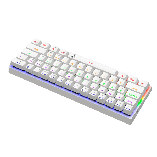 Es un teclado mecánico compacto del tipo 60%, con solo 61 teclas, diseñado para brindar la máxima libertad al ratón sin sacrificar funcionalidad. Destaca como un competidor formidable, equipado con interruptores mecánicos de alta calidad y todas las características esenciales para el juego. Fabricado con ABS reforzado de primera calidad, está construido para resistir largas sesiones de juego. Además, es resistente al polvo y a las salpicaduras, lo que lo hace ideal para ser transportado con facilidad gracias a su cable USB desmontable y su tamaño mini.