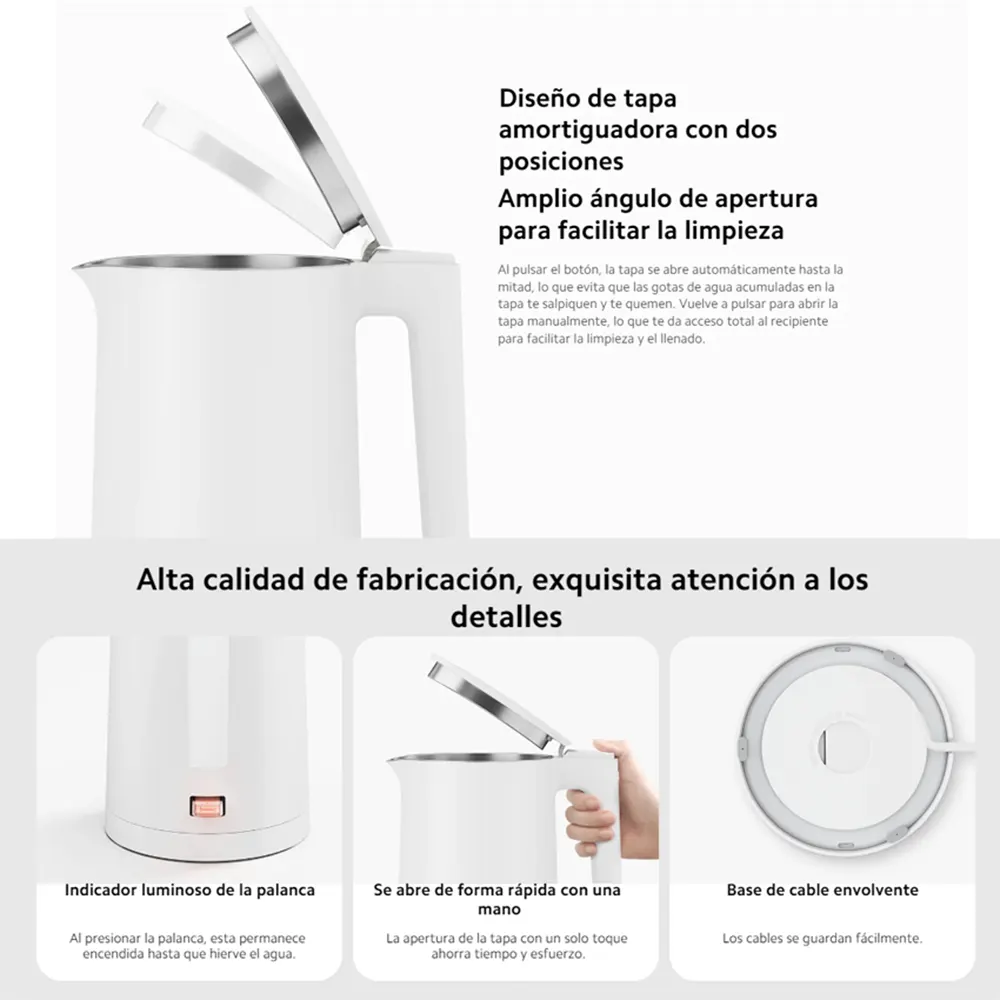DESCRIPCIÓN Xiaomi Electric Water Kettle 2, nueva versión con una capacidad de 1.7 L y potencia de 1800W Capacidad de 1.7 L – Potencia de 1800W – Múltiples opciones de protección – Tanque de acero inoxidable con gran diseño – Estructura de doble capa – Apertura de amortiguación de dos etapas El Xiaomi Electric Water Kettle 2 es un hervidor eléctrico con un diseño propio de la marca y que tiene un mango en forma de 7. Además, posee una capacidad de hasta 1.7 Litros. Por otro lado, ofrece una potencia de 1800w que se apagará de manera automática cuando el agua esté hirviendo. Estructura de doble capa Por otro lado, el tanque interior cuenta con una estructura de doble capa por dentro y por fuera que forma una capa de aislamiento intermedia, aislando las altas temperaturas del interior y evitar quemaduras en el exterior. El interior está desarrollado de acero inoxidable de grado alimentario 304. Tapa con amortiguación en dos etapas Por otro lado, otro aspecto mejorado del Xiaomi Electric Water Kettle 2 cuenta con tapa con apertura de amortiguación de dos etapas, abriéndose una de ellas para evitar salpicaduras y quemaduras y otra manual para poder limpiarlo. Especificaciones técnicas Xiaomi Electric Water Kettle 2 – Hervidor Eléctrico: Marca: Xiaomi Modelo: Electric Water Kettle 2 Potencia: 1800W Volumen: 1.7L Características: Asa vertical Aislamiento térmico de doble capa 4 soluciones de seguridad eléctrica Tapa en 2 etapas Luz LED Energía: Tensión: 220 ~240V Frecuencia: 50/60Hz Dimensiones: 227 x 158 x 262 mm Peso: 1.2 Kg Color: Blanco Contenido de la caja: 1 x Xiaomi Electric Water Kettle 2 – Hervidor Eléctrico